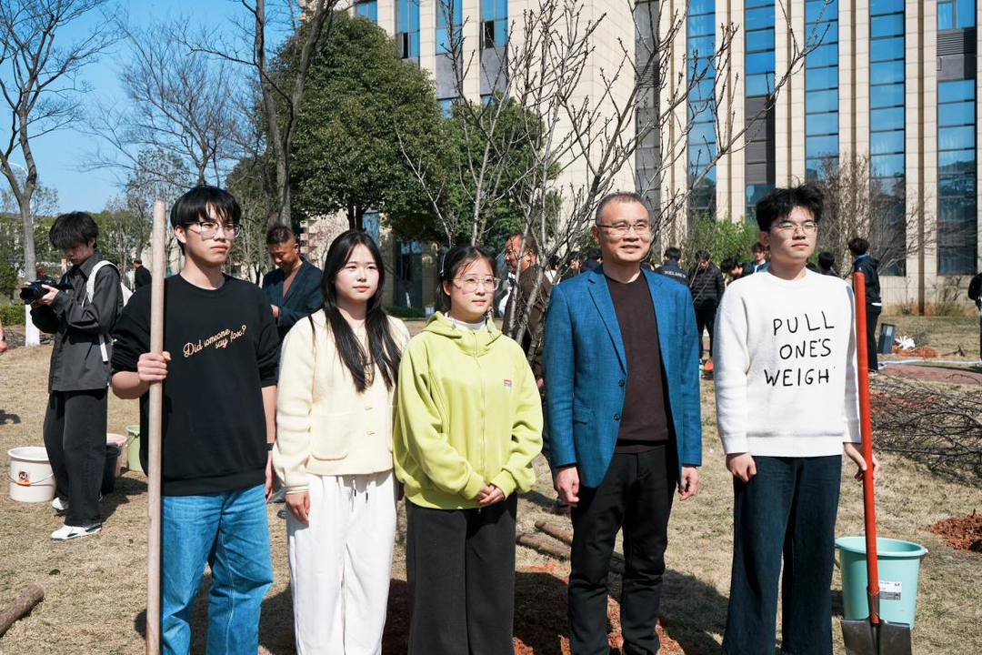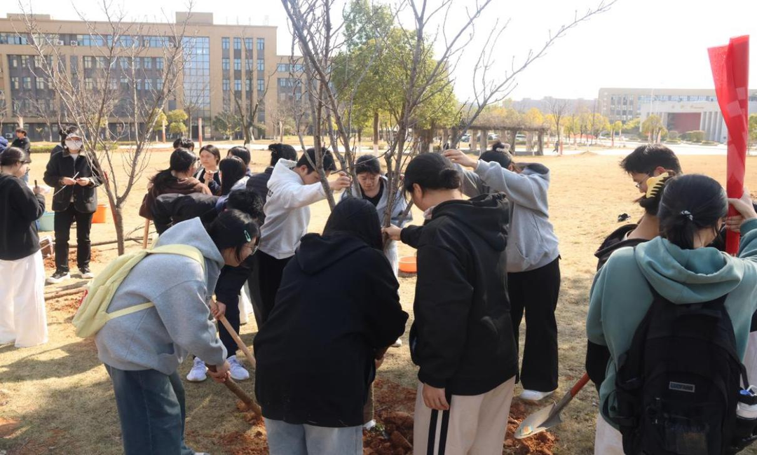 活动现场,春意盎然,干劲十足。师生们默契配合、分工协作,一道道工序有条不紊:挥锹铲土挖树坑,扶正苗株定根基,填土压实固新苗,提桶浇水润沃土。经过一番忙碌,一排排桃树与樱花树迎风挺立,崭新的苗木在春日里焕发出勃勃生机。汗水滑落眉间,欢笑萦绕身旁,泥土的芬芳与新绿的朝气相互交融,勾勒出一幅师生同心、共筑绿色校园的动人画卷,每一棵新苗都扎根沃土,既承载着师生对绿色校园的美好向往,也寄托着对江西师范大学科学技术学院发展的殷切期许。